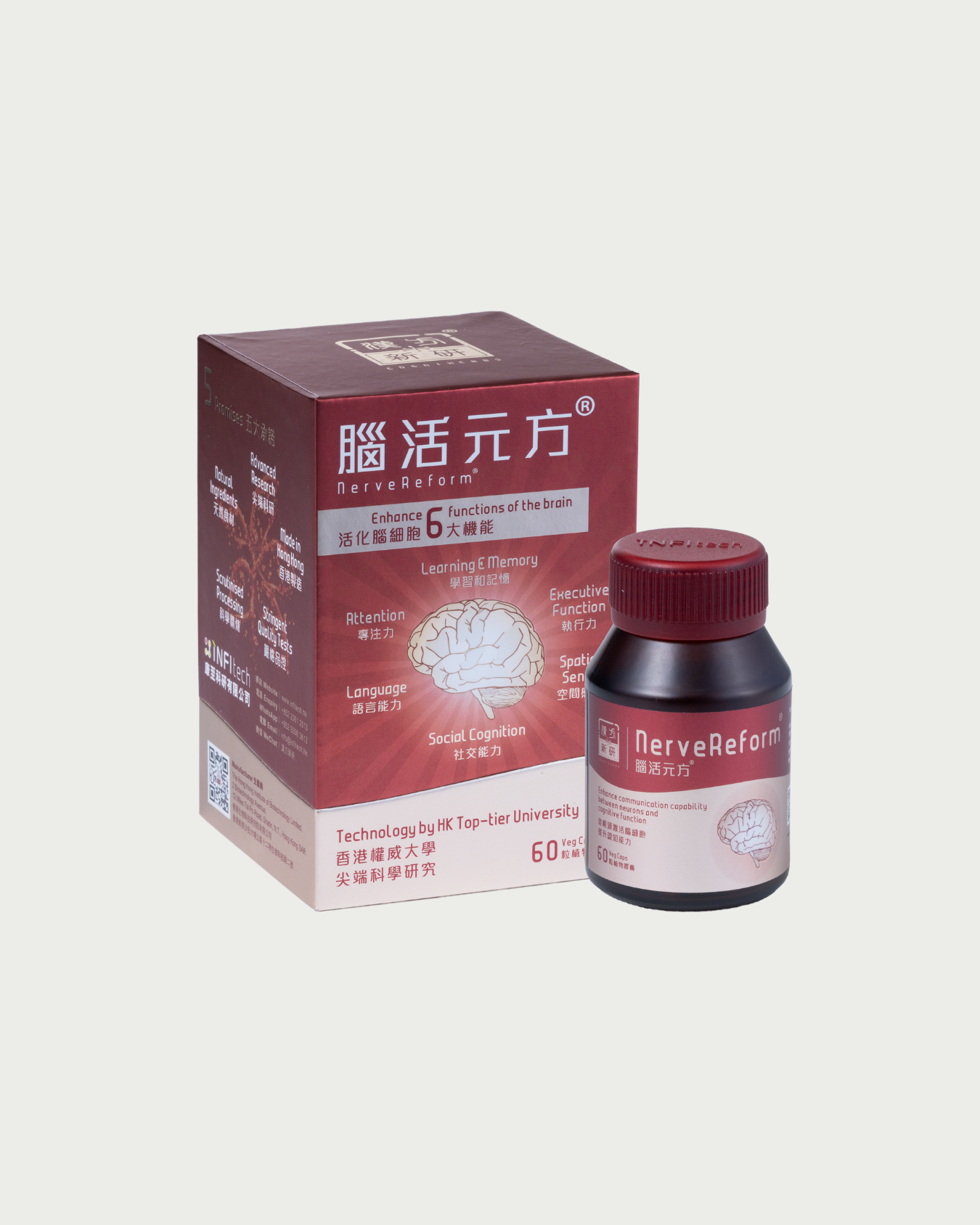 In collaboration with the University, INFItech Limited has employed the technologies in establishing a series of brain health product “Cogniherbs” to meet the growing needs of a rapidly aging population. NerveReform is the first product in the series that can enhance communication between neurons, reduce the risk of cognitive impairment and promote cognitive function. Providing choices for people having concerns on brain health.